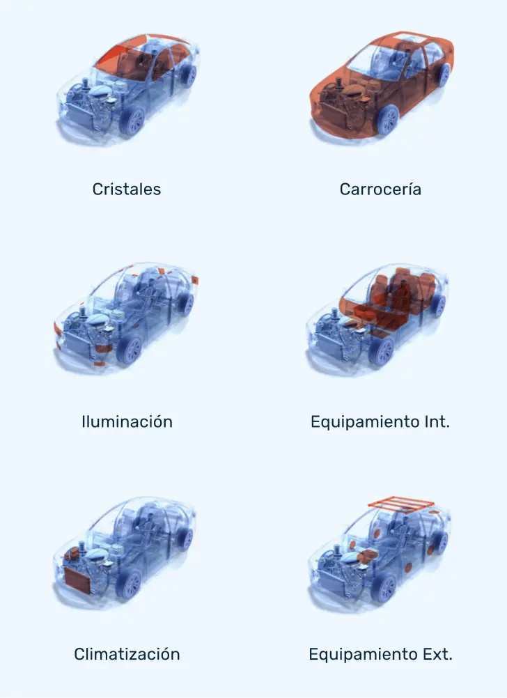 - Cristales (parabrisas, lunetas, vidrios laterales, etc.)